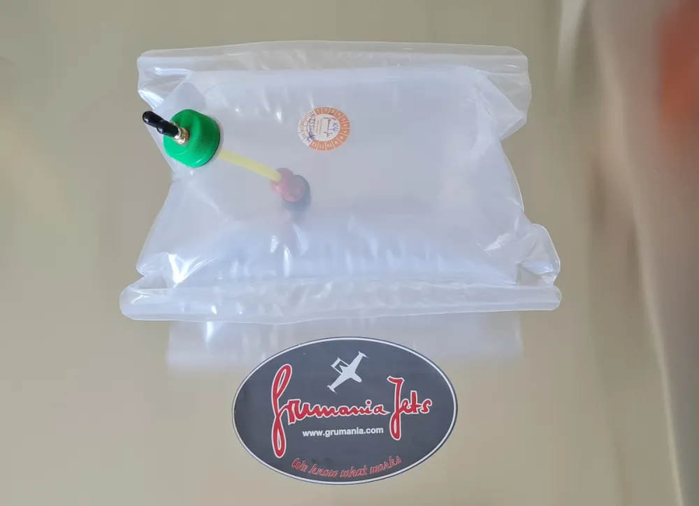 Nach dem Einbau ins Modell, sollte der Tank zunächst mehrmals befüllt und entlleert werden, bevor er in Betrieb genommen wird. Dabei sollte aufmerksam beobachtet werden, ob er sich frei entfalten kann und nicht durch Einbauten in seiner natürlichen Bewegung eingeschränkt wird, oder spitze Gegenstände die Beutelwand gefährden können. Ein Entlüften geschieht abschließend durch Klopfen an die Beutelwand, um die verbliebenen Luftblasen zum Flansch/ Deckel zu bewegen. Dieser höchste Punkt liegt außerhalb des Tankraumes und die Restluft kann dann über den Betankungsschlauch erfolgen. Benutzen Sie einen geeigneten, wirklich dichten Absperrhahn - vorzugsweise ein Kugelhahn von FESTO. Vergleichsprodukte - oft aus Fernost- haben sich als undicht erwiesen. Achten Sie regelmäßig auf mögliche Beschädigungen am Tank und benutzen Sie keinen beschädigten Tank. Öffnen Sie niemals den Deckel am Tank - für das Schließen ist ein Spezialwerkzeug erforderlich. Dies ist Grumania Jets vorbehalten. Beim Lagern des Modells kann Kerosin im Tank verbleiben. Vermeiden Sie jedoch die beiden Extremzustände - total entleert oder total befüllt (diese Maßnahme dient der Vermeidung von unnötiger Faltenbildung).
