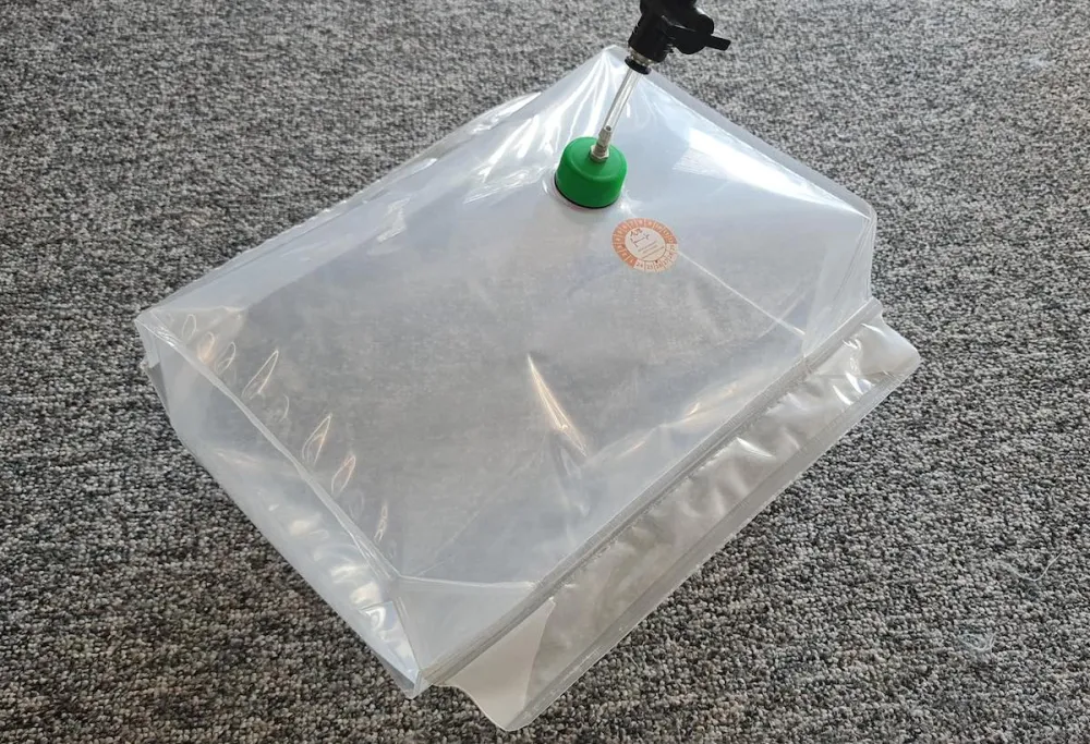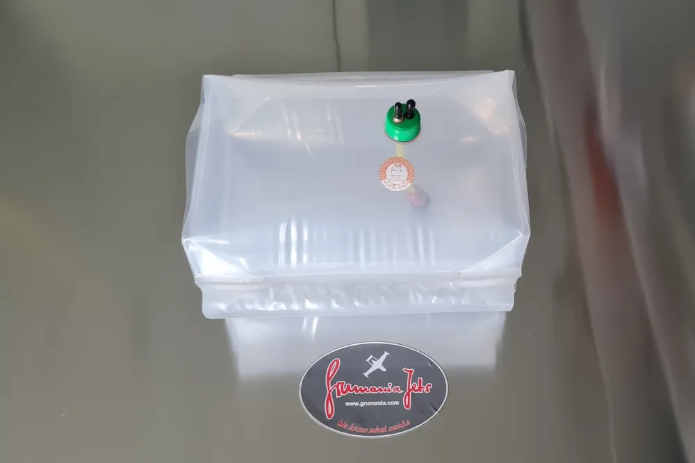 Dieser G-BAG hat ein maximales Füllvolumen von ca. 5,3 Litern. Es ist ein sogenannter Quadertank/ Cuboidtank, der eingearbeitete Bodenteile aufweist, um bei kleinem Raum ein maximum an Füllvolumen zu bieten.