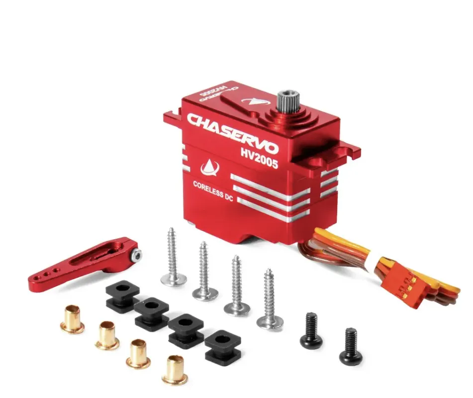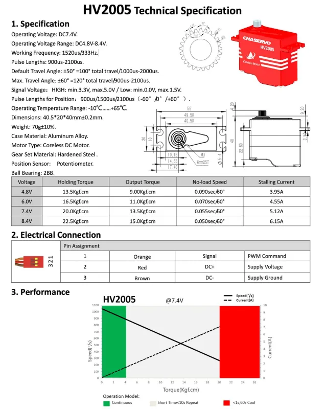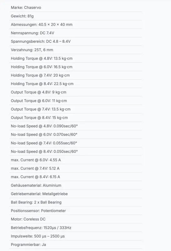Von seinen Außmaßen ist das HV2005 mit 40,5x20x40 ein Standardservo. Die unübertroffene Qualität und die Spielfreiheit machen es aber zu alles anderem als "Standard". Das HV Servo bringt bereits bei 4,8 Volt 13,8 Kg Haltekraft und glänzt mit beachtlichen 22,5 Kg Haltekraft bei 2S-Betrieb (7,4 Volt).